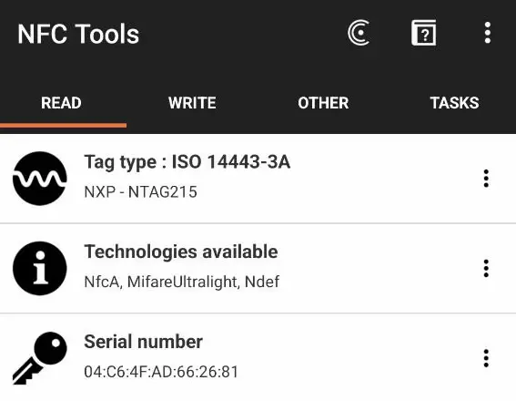 Jika read menggunakan NFC Tools, kartu NXP NTag215 Card yang memiliki ID: 04:C6:4F:AD:66:26:81 saat di tap pada reader ini (EL-1356R02) akan terbaca menjadi 2907686404 (32-bit pertama, reverse bytes).