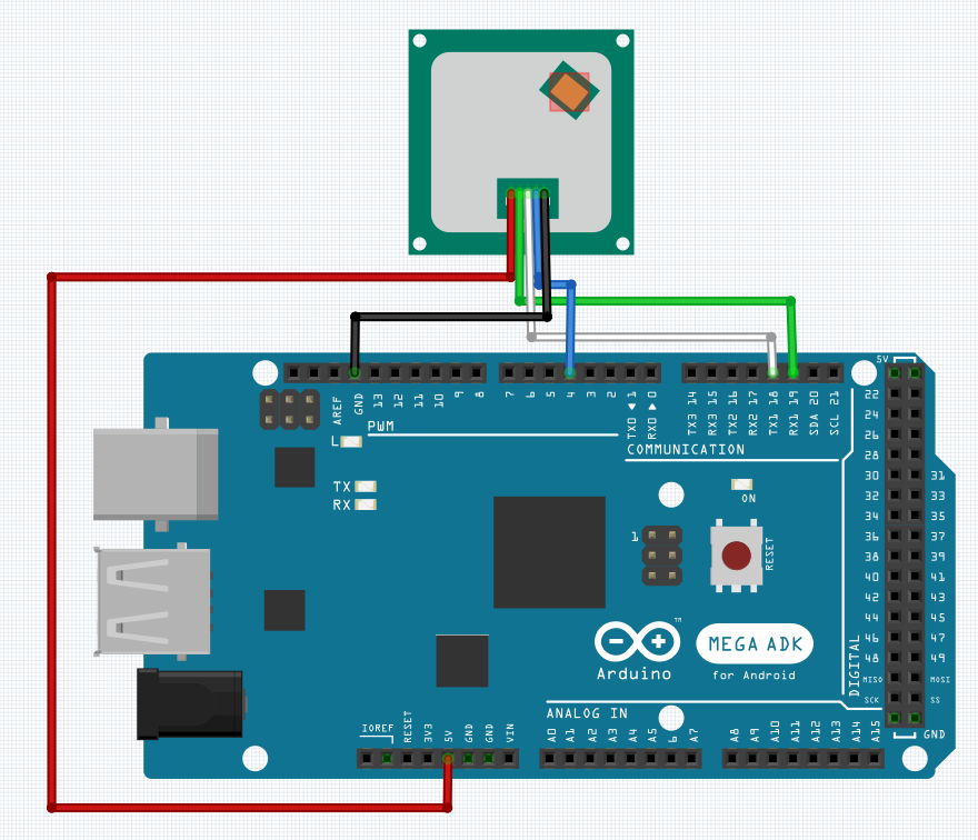 Arduino Mega akan melakukan komunikasi dengan EL-UHF-RMT01 dengan menggunakan hardware serial dengan sambungan rangkaian dari El-uhf-RMT01 sebagai berikut.